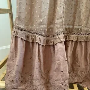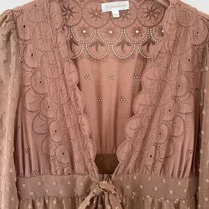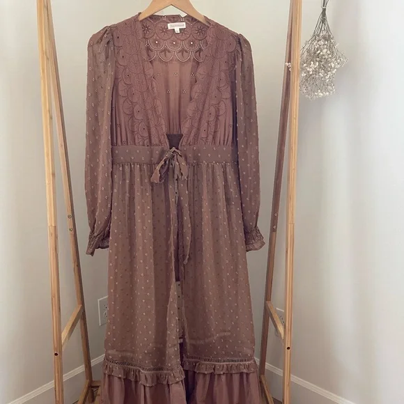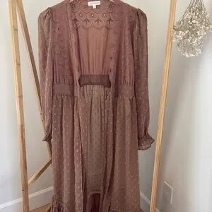 Stunning robe in great condition with romantic details and eyelet design. Slight puffed sleeve and gathered at the wrist. Can be worn tied or open and used inside or outside (as a duster). Very cool for Summer & Spring!