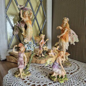 Graceful and ethereal Fairy with butterfly wings in an orange dress among flowers and mushrooms. This vintage resin fairy figurines, dating from the early 2000s, was produced by Zemeno (figurines from Summit Collection and Shudehill Giftware are a little more recent).