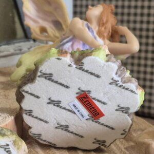 Graceful and ethereal Fairy with butterfly wings in a lavender dress kneeling on the grass. This vintage resin fairy figurines, dating from the early 2000s, was produced by Zemeno (figurines from Summit Collection and Shudehill Giftware are a little more recent).