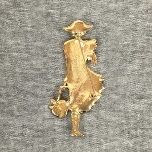 Romantic lady with a puppy and a basket of flowers! Gold metal with black enamel and crystals. Approx. 3" high and 1.25" wide.