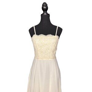 This dreamy vintage gown is a romantic choice for bridal, prom, or formal occasions. Crafted in a soft off-white cream tone, it features a delicately embroidered lace bodice, adjustable spaghetti straps, and a full flowing chiffon skirt that moves beautifully with every step. The dress is fully lined with a secure back zipper and internal bodice support for structure and comfort.