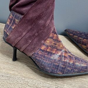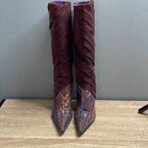 Women’s grape purple Romenni 80s Vibe Elegant Knee-High Kitten Heel Pointed Toe Boots with genuine Suede pleated upper shaft.