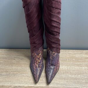 Romenni 80s Vibe Elegant Knee-High Kitten Heel Pointed Toe Boots Suede Snake 36