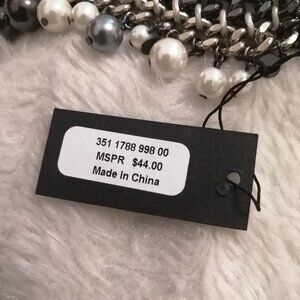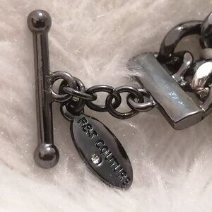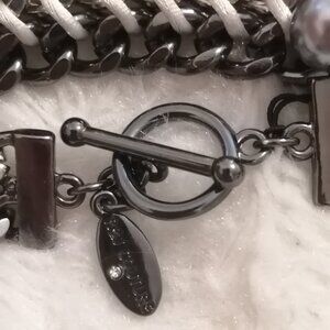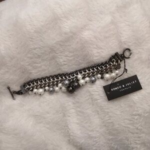 This listing is for a bracelet made by Romeo & Juliet Couture. It features gunmetal and silver tone chains laced together by a silver/light grey satin cord, as well as faux pearl dangles in white, light grey, and dark grey/black (they match the gunmetal tone). Additional findings, brand hangtag, and toggle clasp are also in the gunmetal tone.