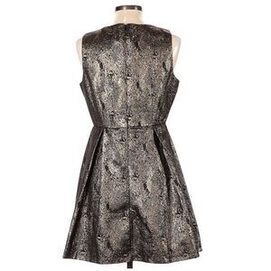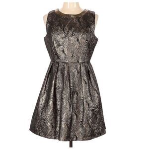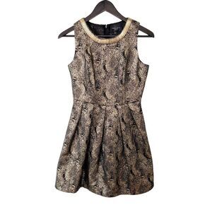 Elegant mini dress by Romeo & Juliet Couture. Features a shimmering gold pattern. Perfect for special occasions.