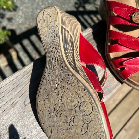 Beautiful red leather sandals with kitten wedge heel. SO COMFORTABLE! Each sandal has three adjustable straps to create the perfect fit for your feet. Leather sole next to your feet for additional comfort. Sylish details make these stand out. You will get a lot of compliments AND a lot of wear out of these cuties.
