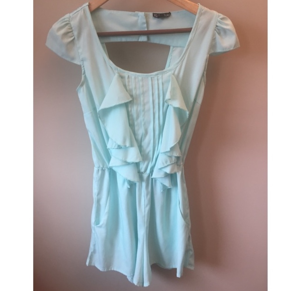 Mint romper. Ruffle front. Open back. And it has pockets!. Size small. EUC.