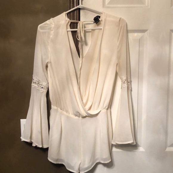 Polyester romper with wide sleeves and floral design on sleeves.