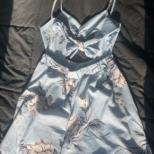 Blue with flowers romper. Straps around shoulders and ties up at back (so can adjust to fit how you like) cut out triangle in the front and the back has a cup out as well. Very flattering!