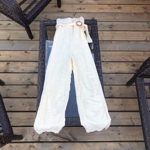 Super cute 80s style romper. Fits in all the right places and it’s a beautiful subtle yellow. Halter top and belt around the waist! Pants fall to mid calf on me, however I am 6ft. Could be full length depending on height.