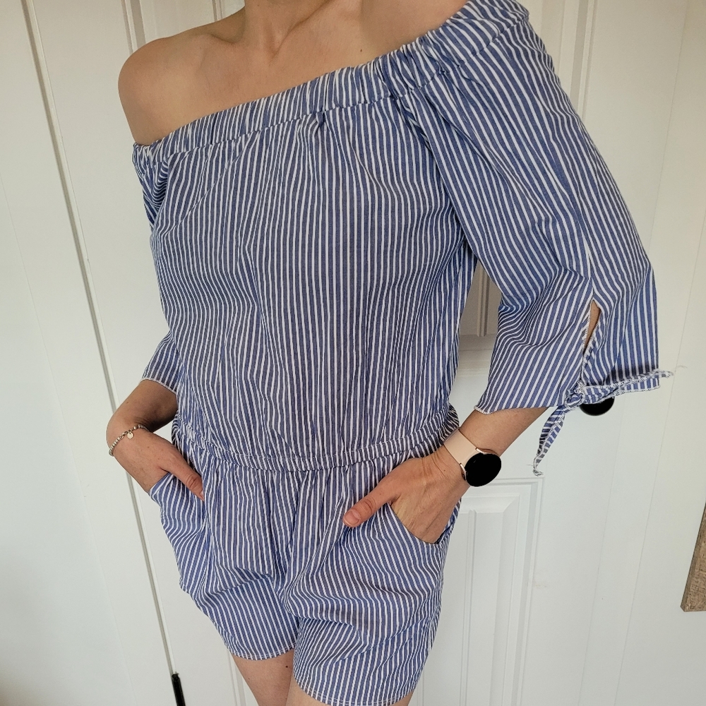 This romper has pockets!! It is off the shoulder but also has enough elastic at the neckline to play with placement. 3/4 length sleeves that finish in a little tie.