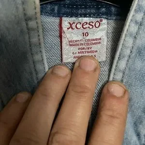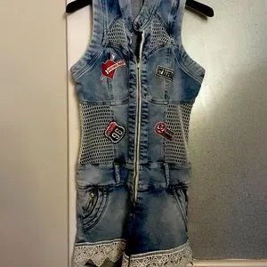 XCESO Designer Brand. Acid wash denim with various cute stitched patches. Gold label on rear side. Legs encased with white lace . One zipper from neck to belly.