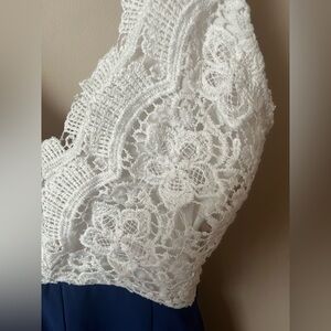 White and blue romper in good used condition. Size small has some tears as seen in photo.
