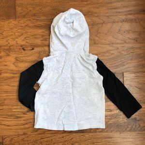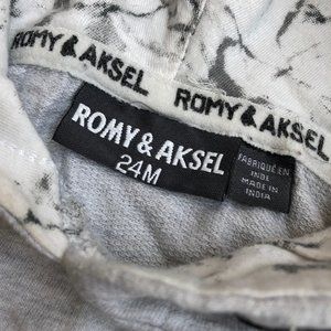 Stylish hooded pullover from Montreal based brand Romy & Aksel, size 24 months. Great details - patch sewn on front and a marble pattern lining the hood. PRE-OWNED EXCELLENT CONDITION.