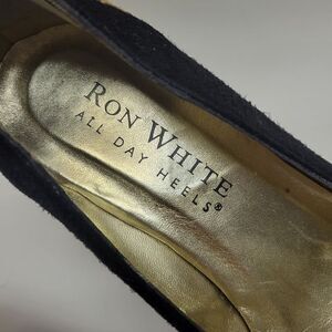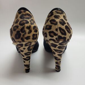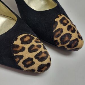 Comfortable design "All Day Heels" from Ron White with cowhide ankle and heel and toe point with a cheetah print design. Rest of shoe upper is a black suede. Good grip rubber soles. Excellent preloved condition. 3.5" heel height.