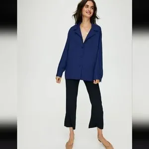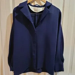 This is a relaxed shacket with a shirt lapel and a front-button closure. It’s made with a basketweave fabric from Japan.