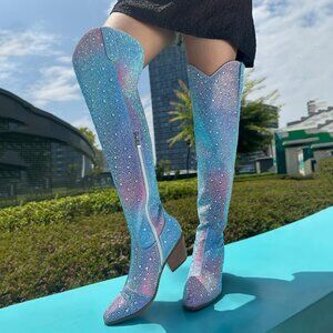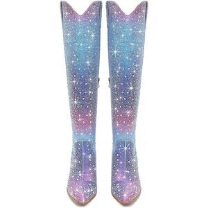 Ronilurn Women Blue Pink Rhinestone Pointed Toe Cowgirl Boot Pull On Side Zipper