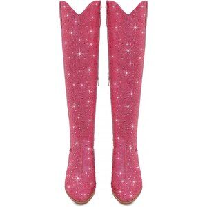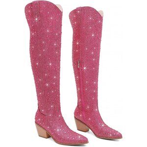 Ronilurn Women Hot Pink Rhinestone Pointed Toe Cowgirl Boot Pull On Side Zipper