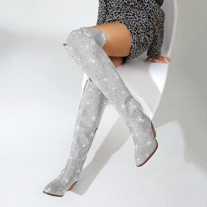 Ronilurn Womens Silver Rhinestone Pointed Toe Cowgirl Boot Pull On Side Zippers