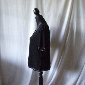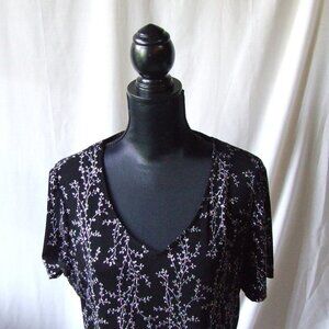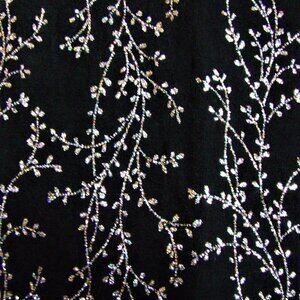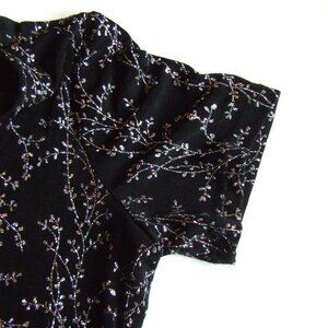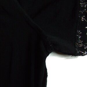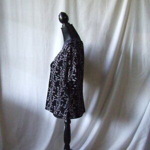 Vintage 1980s short sleeve blouse from Ronni Nicole by Ouida. Ribbed black v-neck top with silver glitter leaf like pattern. Size XL. 90% acetate and 10% spandex. There are not any stains, tears, or holes. Very good, vintage condition.
