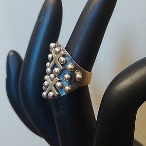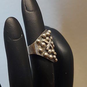 This Santa Fe Cross Sterling Silver Ring was handmade by Navajo silversmith Ronnie Willie. Sterling Silver beads and the "Santa Fe Cross" are set against deeply oxidized sterling silver for a striking contrast.
