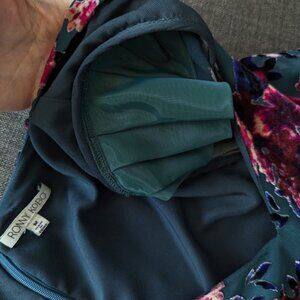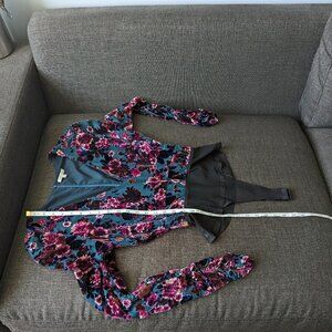 This stunning velvet bodysuit from Ronny Kobo is in excellent used condition with no noted rips, holes, stains, or areas of excess wear. Features a deep v neckline, sheer puff long sleeves and a gorgeous floral velvet patterned fabric in jewel tones of teal blue, purple, and pink.