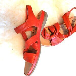 In like-new condition! Selling for my friend who wore them jus 2x and decided that she would prefer a smaller size. The only sign of wear on the bottom sole. No scuffs at all. A VERY comfortable sandal for walking. Easy peasy close with velcro. A beautiful true red color.