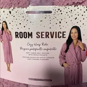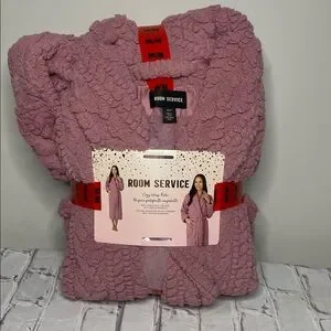 Soft and plush pink robe by Room Service. Perfect for lounging.