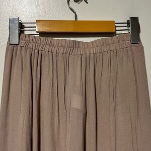 Elevate your loungewear with these chic and comfortable Room Service lounge pants in size Medium. These taupe-colored pants feature a flowy, asymmetric hem for a relaxed yet stylish look. Designed with an elastic waistband for a perfect fit, they are crafted from 100% rayon for lightweight and breathable comfort.