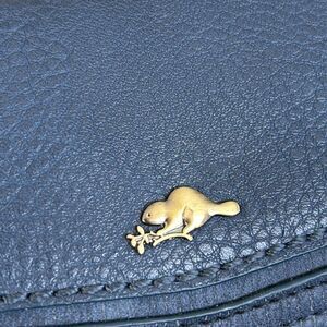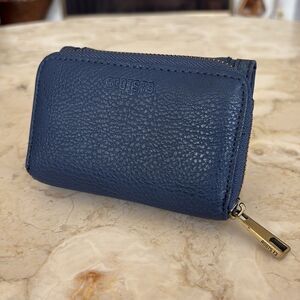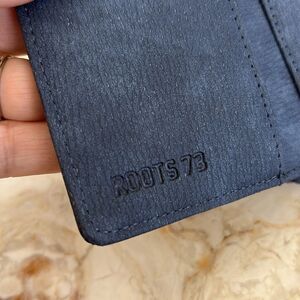 In very good preowned condition great Roots compact wallet in blue vegan leather.