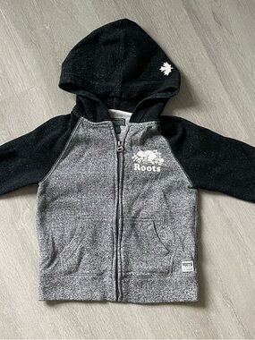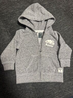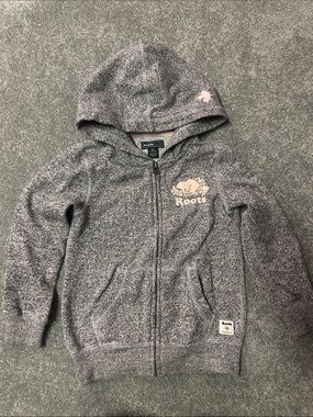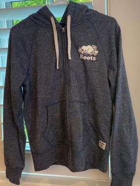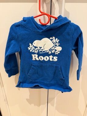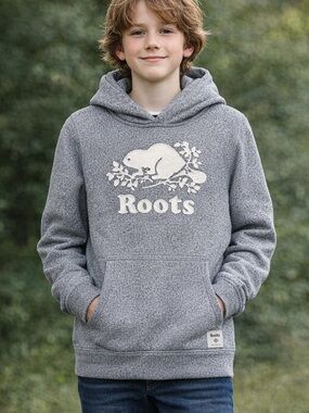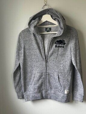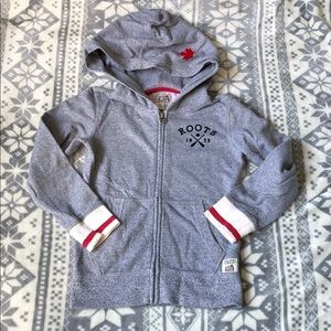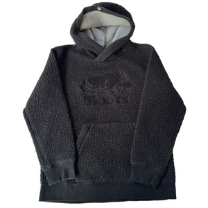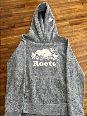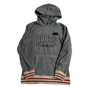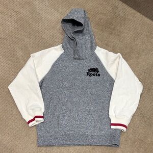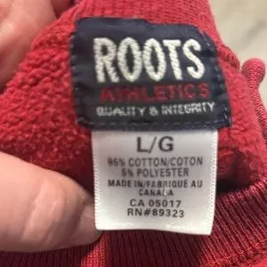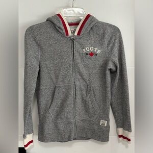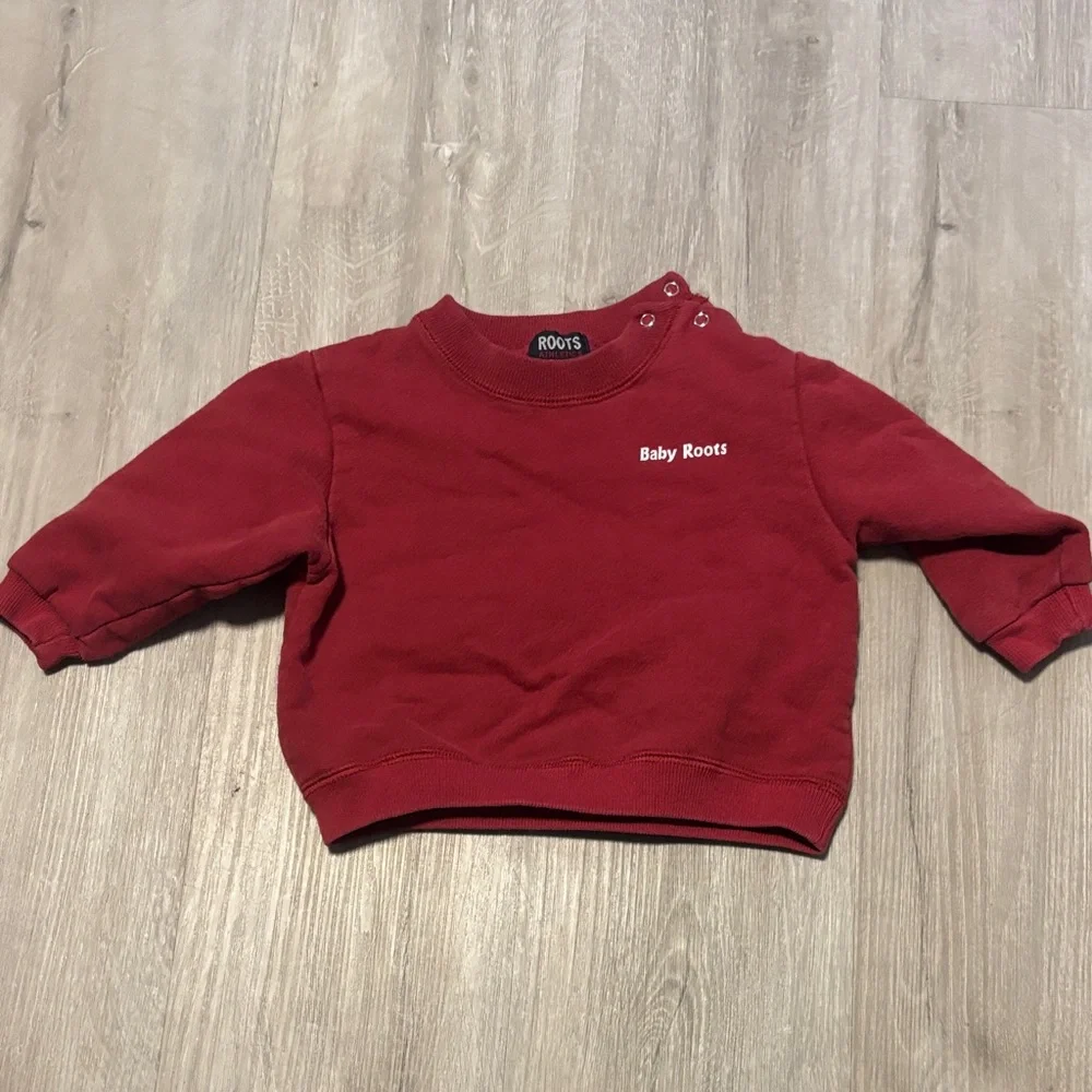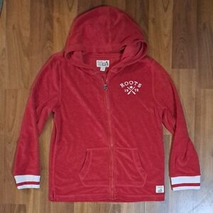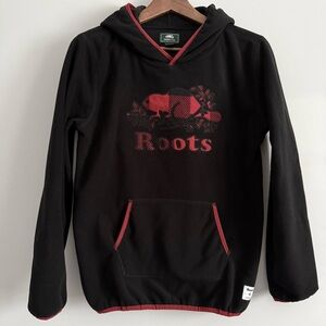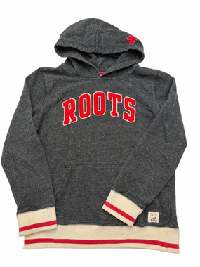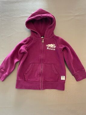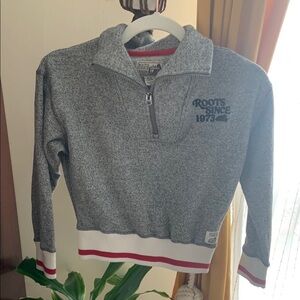 Cozy burgundy sweatshirt by Roots. Features shoulder buttons. Ideal for casual wear.