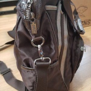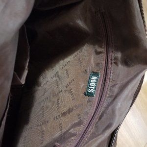 Awesome vintage crossbody bag by Roots. Shiny espresso colour with adjustable double shoulder strap, lined inside pocket. Measures 14 inches across the top and 15 inches across bottom; approx. 13 inches in height. In good used condition with normal signs of wear.