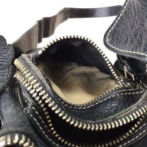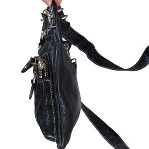 Canadian made crossbody Village Tribe bag featuring soft black Italian leather, silver hardware and an adjustable and removable wide leather strap.