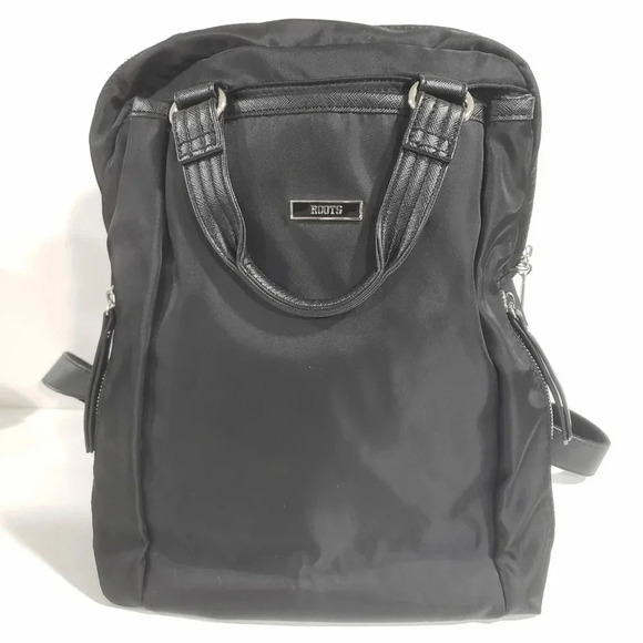 Features:faux leather straps and top handles.,lots of storage,1 back zip up pocket,1 large pocket in front with snap closure, 2 side front zip pockets, 2 pockets inside and adjustable straps as well as silver metal hardware.