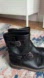Stylish black leather moto boots from Roots. Features buckle straps. Durable sole for comfort. Size 7.5W