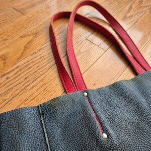 Elegant black leather tote. Features striking red handles. Perfect for everyday use.