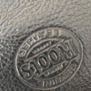 Sleek black leather wallet. Includes a sturdy keychain clip. Features embossed Roots logo.