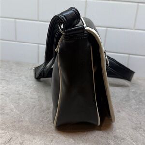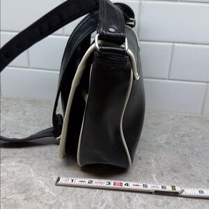 Chic Roots shoulder bag in black and cream. Features front zip pocket and adjustable strap.