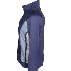 Comfortable soft shell performance jacket in 2 tones of blue with white accent colors. Has a full zippered front closure with 2 side zippered pockets.