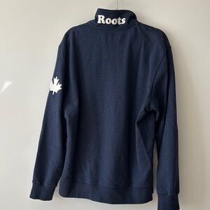 Experience comfort and style with the Roots Blue Zip Up Sweater, featuring a soft fleece-like material and a subtle logo on the chest. The standing collar and textured fabric add a touch of sophistication to this versatile piece.