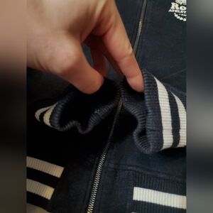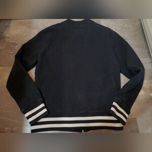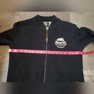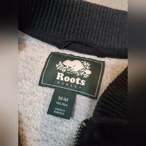 Roots Bomber Jacket. Long sleeves. Black, A Bit Dewashed. Bit Of White. Size M, see pictures for measurements. Thin fleece inside. Front printed logo, suede feels. Varsity. 2 front pockets. Fitted style. Excellent condition. No stain, no rip. Non smoking house.