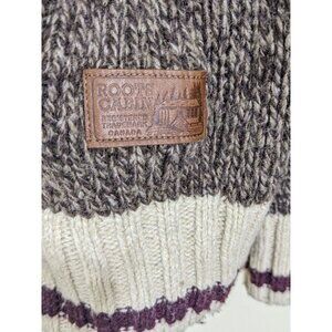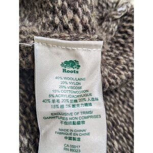 Elevate your winter wardrobe with this classic brown Roots Cabin Canada knit sweater cardigan. Made with a cozy wool blend and chunky knit style, this sweater is perfect for both travel and casual occasions. The full zip and pockets provide functionality, while the elbow patches and logo accents add a touch of style. The mock neck and long sleeves keep you warm in colder seasons, making it perfect for fall, winter, and spring. The sweater comes in size M and is made of a combination of nylon, viscose, cotton, and wool. The nature, cabin, and outdoors theme make it a great addition to any outdoor enthusiast's wardrobe.