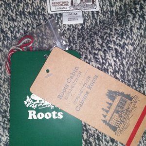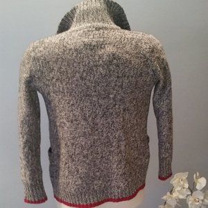 Roots Cabin grey waterfall cardigan. Red trim around cuff and bottom. Cotton blend. Indicates Size M Youth but fits like an XS-S. Womens NWT