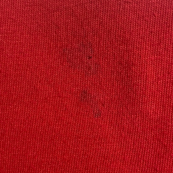 A couple stains, one red mark above maple leaf and one dark mark on abdomen area. See photos.