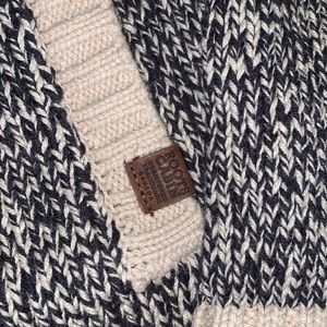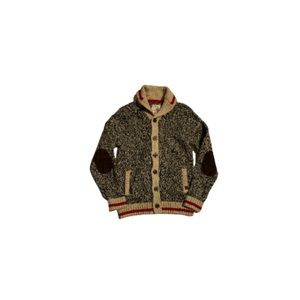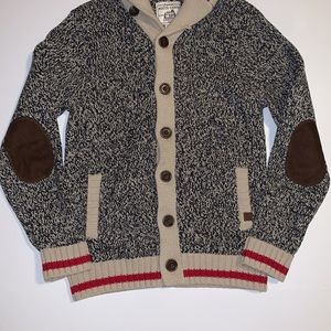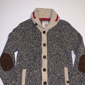 Roots Canada grey, cream, and red cabin sweater with brown microsuede elbow patches in girl’s size large.