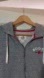 Charcoal zip-up hoodie with front pockets. Features white drawstrings and red accents. Classic Roots style.