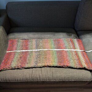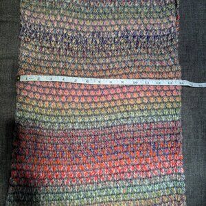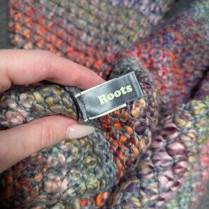 Roots infinity scarf in excellent used condition. This cozy accessory features a stunning color progression from gray through shades of coral, green, and purple in a chunky knit pattern. The generous size and wool-acrylic blend provide both warmth and style, while the infinity design ensures easy wear.