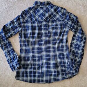Roots Flannel Plaid Button Down Shirt Women's Size S Navy Blue Gray Snap Buttons 100% Cotton Excellent Condition Roots Canada