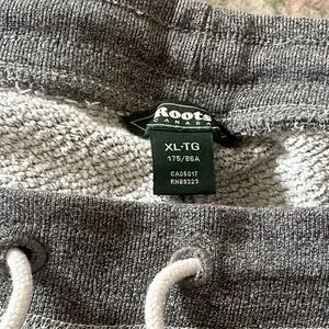Classic Roots sweatpants in soft gray. Elastic waistband with functional drawstring. Cozy loopback interior for comfort. Casual tapered silhouette for everyday wear. In great condition, except for one mark on leg (pictured).