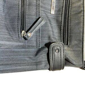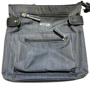 This Roots cargo-style shoulder bag is ideal for busy days. It features durable grey fabric, large external pockets, and a zip-up top. The adjustable strap ensures a comfortable fit. The spacious interior can hold books, tech, and more. Gently used and in excellent condition.